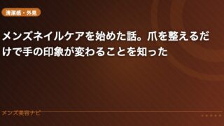 清潔感・外見メンズネイルケアを始めた話。爪を整えるだけで手の印象が変わることを知った 爪なんて伸びたら切るだけ、という考え方だった。手入れといえばそれだけで十分だと思っていたし、爪を磨いたり整えたりするのは女性のものだと決めつけていた。 気づかせてくれたのは、取引先の会食でのことだった。名刺交換のときに相手の手元を見て、「爪がきれいだな」と思った。特別なことをしているわけではなく、ただ爪が清潔に整っていた。でもそれだけで、手元の印象がまったく違う。「男でもこういうケアをして... 2026.03.24 2026.03.25清潔感・外見