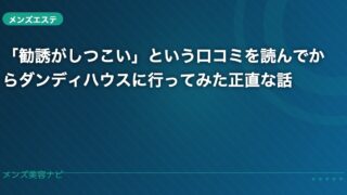 ダンディハウスの体験予約をしようとして、まず口コミを調べた。そしたら「勧誘がしつこい」「高額なコースを強引に勧められた」という書き込みが結構あって、正直迷った。 でも一方で「肌がきれいになった」「スタッフが親身だった」という声も多くて、評判が真っ二つに割れている印象だった。「これは行ってみないとわからない」と思って、とりあえず体験だけ行くことにした。どんなサービスでも、ネットの口コミは良い...