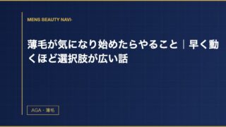 AGA・薄毛薄毛が気になり始めたらやること|早く動くほど選択肢が広い話 薄毛が気になり始めたら最初にやるべきことを解説。放置するほど選択肢が狭まるAGA治療の基本と、クリニック受診のタイミングや流れを紹介します。 2026.03.23 2026.03.25AGA・薄毛