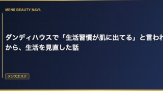 メンズエステダンディハウスで「生活習慣が肌に出てる」と言われてから、生活を見直した話 施術中にスタッフさんから言われた一言 ダンディハウスでフェイシャルを受けているとき、スタッフさんが肌を触りながら「最近、ちょっと生活習慣出てますね」と言った。 2026.03.14 2026.03.25メンズエステ