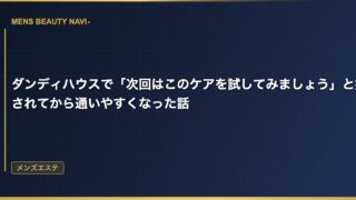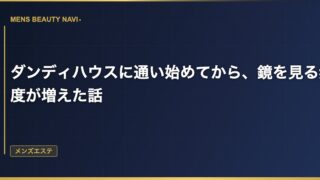 メンズエステダンディハウスで「次回はこのケアを試してみましょう」と提案されてから通いやすくなった話 通い始めた頃は毎回同じコースだった ダンディハウスに通い始めた最初の半年は、毎回同じフェイシャルコースを受けていた。それでも十分効果はあったし、施術後の肌の調子もよかった。 2026.03.14 2026.03.25メンズエステ