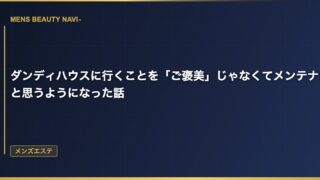 メンズエステダンディハウスに行くことを「ご褒美」じゃなくてメンテナンスと思うようになった話 最初は「自分へのご褒美」だと思って通っていた ダンディハウスに通い始めた頃は、「仕事を頑張ったご褒美」という位置づけだった。忙しい日々のなかで、月に2回だけ自分を甘やかす時間。 2026.03.14 2026.03.25メンズエステ