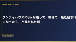 メンズエステダンディハウスに8ヶ月通って、職場で「最近肌きれいになった?」と言われた話 ダンディハウスに通い始めて8ヶ月の現状 ダンディハウスに通い始めて8ヶ月が経った。月2回のペースでフェイシャルを中心に施術を受けていて、ここ数ヶ月は肌の状態がかなり安定してきた。 2026.03.14 2026.03.25メンズエステ