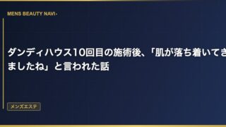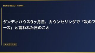 メンズエステダンディハウス9ヶ月目、カウンセリングで「次のフェーズ」と言われた日のこと 9ヶ月通ったダンディハウスでの変化 ダンディハウスに通い始めて9ヶ月が経った。最初は体験コースからスタートして、フェイシャルとボディの両方を月2回のペースで続けてきた。 2026.03.14 2026.03.25メンズエステ