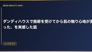 メンズエステダンディハウスで施術を受けてから肌の触り心地が変わった、を実感した話 施術直後の肌を触ったとき、感動した ダンディハウスのフェイシャル施術が終わって、スタッフさんに「どうぞ、触ってみてください」と言われた。言われるがまま頬に手を当てたら、びっくりした。 2026.03.14 2026.03.25メンズエステ