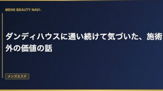 メンズエステダンディハウスに通い続けて気づいた、施術以外の価値の話 最初は「施術で肌がきれいになること」だけが目的だった ダンディハウスに通い始めたとき、目的はシンプルだった。肌をきれいにしたい。毛穴を目立たなくしたい。 2026.03.14 2026.03.25メンズエステ