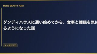 メンズエステダンディハウスに通い始めてから、食事と睡眠を気にするようになった話 エステに通う前は、食事も睡眠も適当だった ダンディハウスに通い始める前の自分の生活はひどいものだった。昼はコンビニ弁当、夜はラーメンか牛丼、寝るのは毎日深夜1時過ぎ。 2026.03.14 2026.03.25メンズエステ