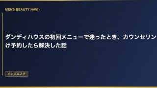 メンズエステダンディハウスの初回メニューで迷ったとき、カウンセリングだけ予約したら解決した話 ダンディハウスに興味はあったけど、何を選べばいいかわからなかった メンズエステに行こうと決めたはいいものの、ダンディハウスのサイトを見るとメニューがたくさんある。 2026.03.14 2026.03.25メンズエステ