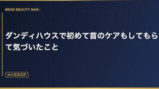 メンズエステダンディハウスで初めて首のケアもしてもらって気づいたこと フェイシャルエステで「首もやりますね」と言われて驚いた ダンディハウスのフェイシャル施術を受けてるとき、スタッフさんが「首のほうもケアしていきますね」と言って、顎の下からデコルテにかけて施術を始めた。 2026.03.14 2026.03.25メンズエステ