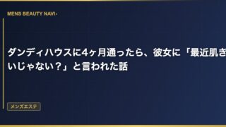 メンズエステダンディハウスに4ヶ月通ったら、彼女に「最近肌きれいじゃない?」と言われた話 彼女は肌のことなんて気にしていないと思っていた ダンディハウスに通い始めたとき、彼女には「エステ行ってる」とだけ伝えていた。特に詳しく聞かれることもなく、「ふーん」くらいの反応。 2026.03.14 2026.03.25メンズエステ