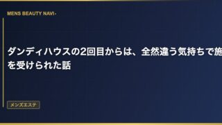 メンズエステダンディハウスの2回目からは、全然違う気持ちで施術を受けられた話 初回は正直、ずっと緊張していた ダンディハウスの初回体験のことは前にも書いたけど、あのときは本当に緊張していた。受付で名前を言うのもぎこちなかったし、カウンセリング中も「何を聞かれるんだろう」「変なこと言ったらどうしよう」と内心ドキドキしっぱなし。 2026.03.14 2026.03.25メンズエステ