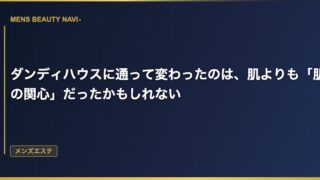 メンズエステダンディハウスに通って変わったのは、肌よりも「肌への関心」だったかもしれない 通い始めた動機は「肌をきれいにしたい」だった ダンディハウスに通い始めたのは、顔のテカりとニキビ跡がどうにかならないかと思ったからだった。自分でスキンケアをしてもあまり変わらなくて、プロに頼ってみようと思ったのがきっかけだ。 2026.03.14 2026.03.25メンズエステ