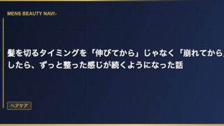 ヘアケア髪を切るタイミングを「伸びてから」じゃなく「崩れてから」にしたら、ずっと整った感じが続くようになった話 「そろそろ切らないと」で美容院に行っていた 美容院に行くタイミングを「髪が伸びたかどうか」で決めていた。襟足が服に当たるようになったら行く。 2026.03.14 2026.03.25ヘアケア
